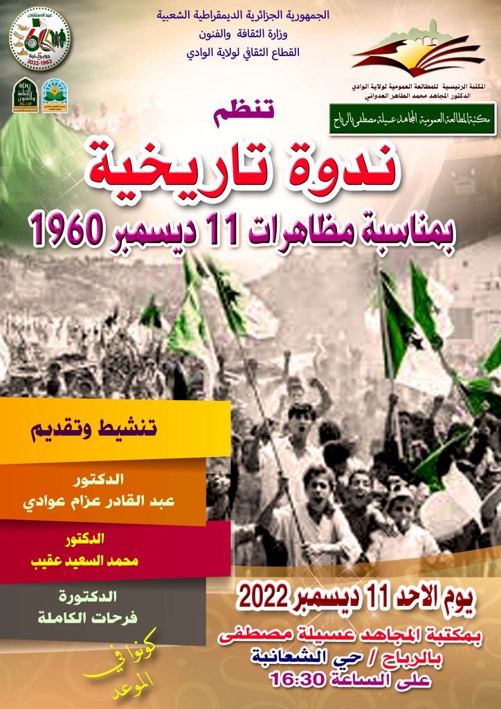 ندوة تاريخية بمناسبة مظاهرات 11ديسمبر 1960 Post author:aboubaker Post published:25 يناير، 2023 Post category:إعلانات المكتبة / نشاطات المكتبة Post comments:0 Comments يوم الاحد 11 ديسمبر 2022 You Might Also Like الندوة الفكرية للشيخ الهاشمي الشريف 23 مارس، 2022 23 مارس، 2022 قراءة الصورة الفوتغرافية القديمة / رحلة عبر الصور القديمة لوادي سوف 23 مارس، 2022 اترك تعليقاً إلغاء الردCommentEnter your name or username to comment Enter your email address to comment Enter your website URL (optional) احفظ اسمي، بريدي الإلكتروني، والموقع الإلكتروني في هذا المتصفح لاستخدامها المرة المقبلة في تعليقي.